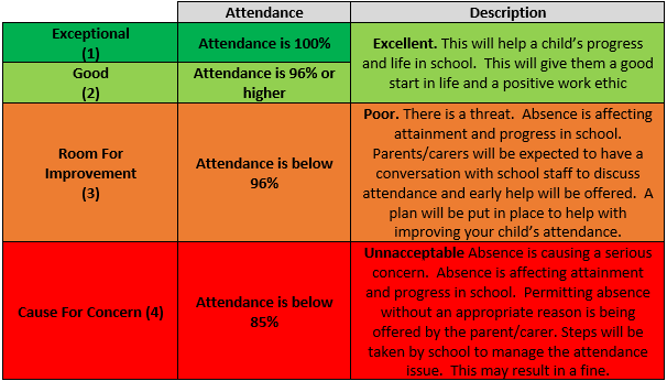 If your child is a persistent absentee or has persistent lateness, they will be monitored regularly. Parents or carers may be contacted to discuss absence or lateness and support will be offered. If absence and lateness continues then a parent or carer may be asked to come into school for a meeting. Below is a RAG rating that identifies the different categories for attendance.